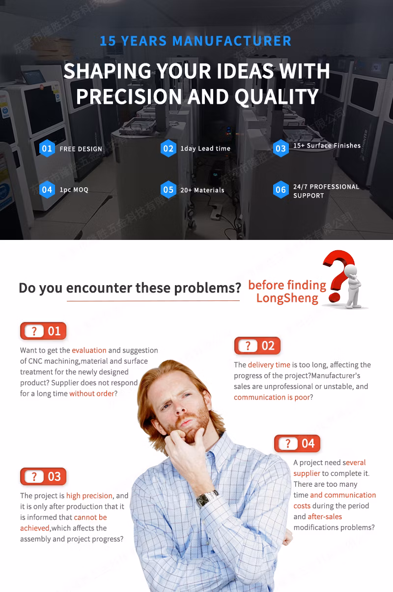 Longsheng offre online un servizio di stampa 3D leader del settore. Che si tratti di prototipi o di parti di produzione, possiamo realizzarli su richiesta in un solo giorno. Siamo il vostro punto di riferimento per la fornitura di parti stampate in 3D accurate, precise e personalizzate a un prezzo conveniente. Carica il file CAD 3D per  ottenere un preventivo online  e tempi di consegna in pochi secondi. Stampiamo tutto, dai singoli prototipi alle migliaia di parti di qualità produttiva.