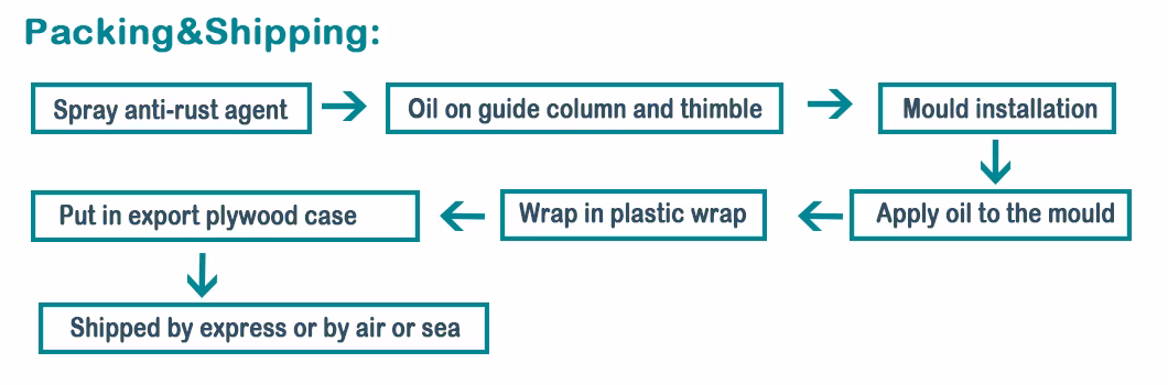 A:1. Progettazione di stampi da disegni o campioni di prodotti. 2. Confermare i disegni con il cliente. 3. Creare stampo.  4. Test T1 e invio dei campioni al cliente per la regolazione. 5. Regolare lo stampo e ripetere il test e inviare i campioni al cliente per l'approvazione. 7. Ricevere conferma dal cliente. 8.inviare lo stampo o organizzare la produzione di serie.